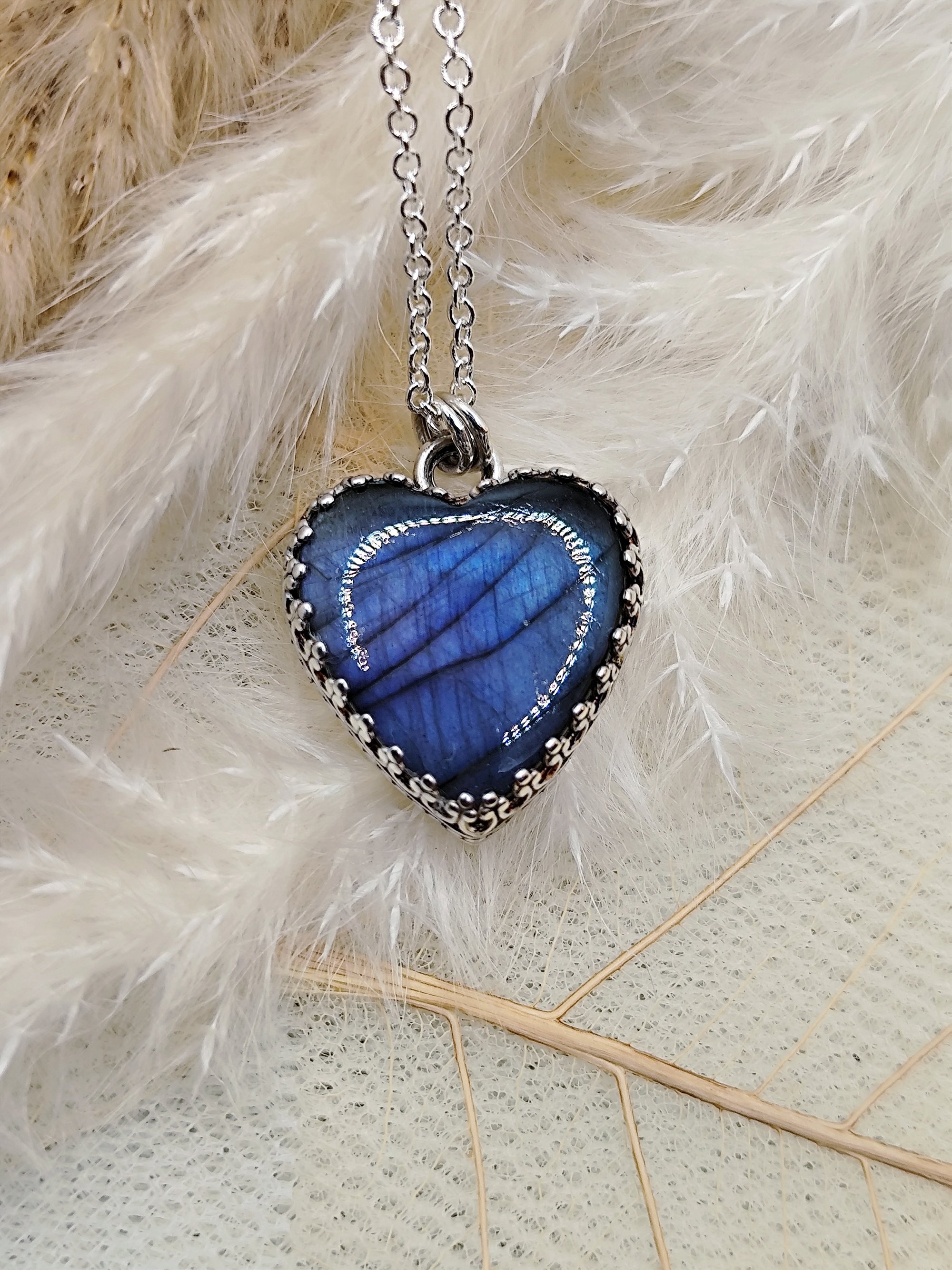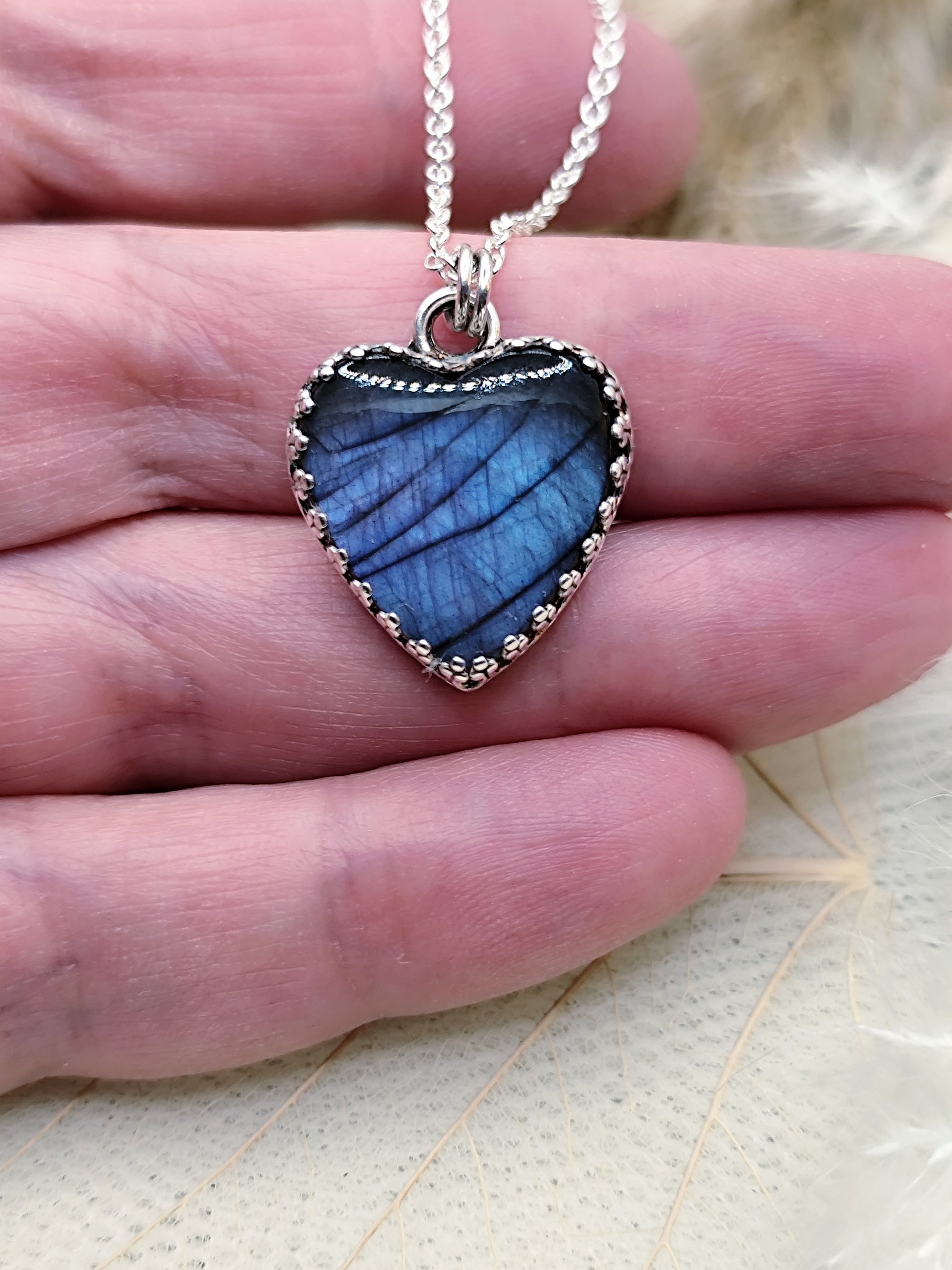 This stormy denim blue labradorite gives some moody vibes and the natural patterns of the stone are beautifully distributed across it. The heart is nested in an intricate gothic like crown gallery. The piece is made in sterling silver. A sterling silver plated trace chain is included ( 18"/ 45cm length ). Alternatively, you can swap this chain for a sterling silver one, just add to the order.